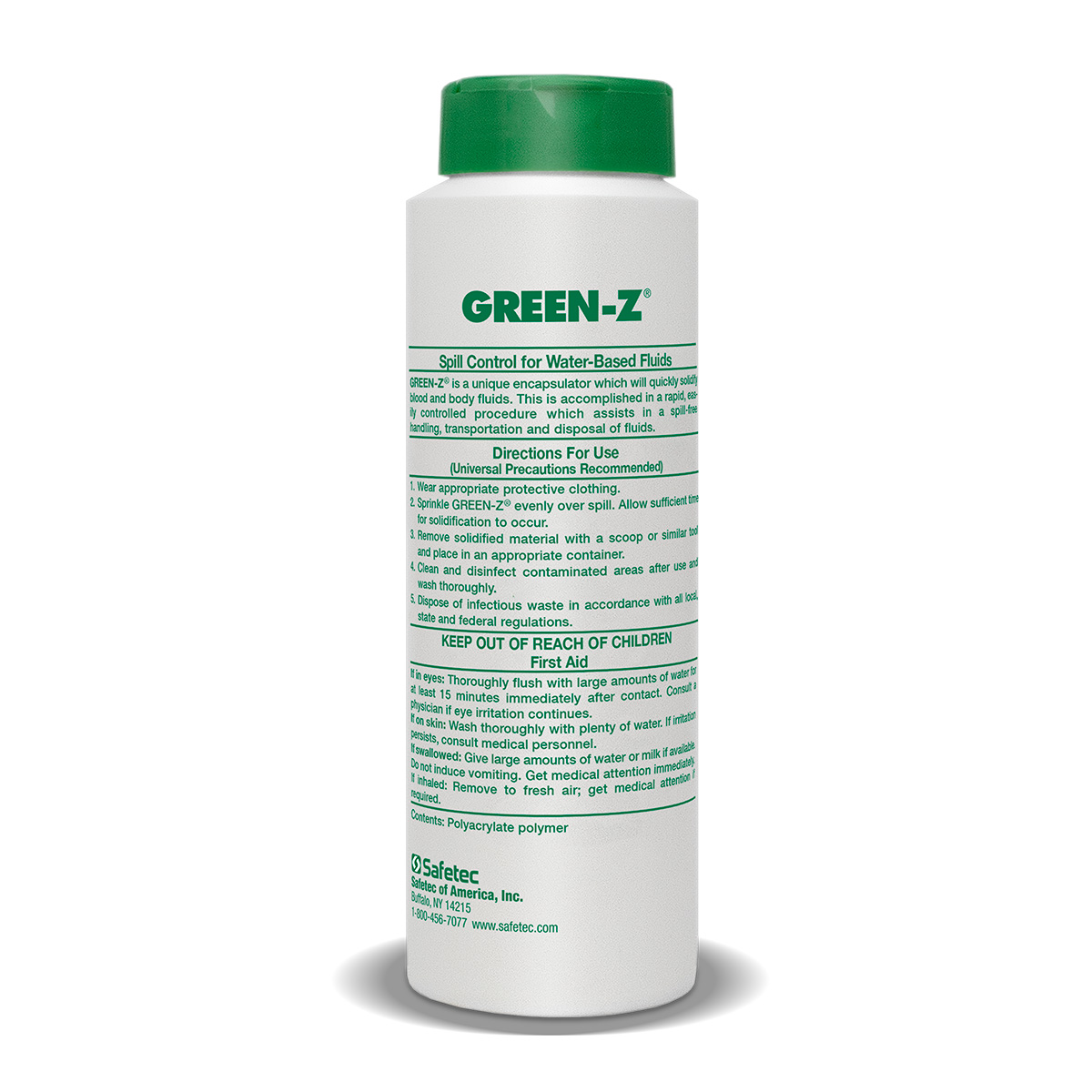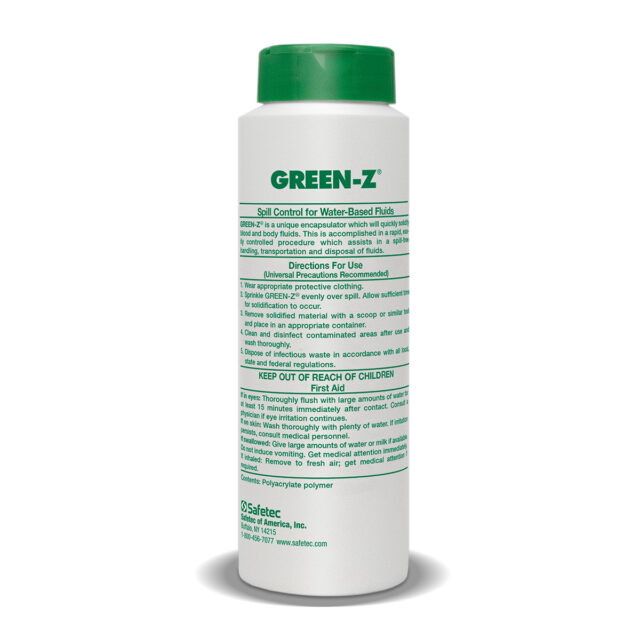 Experience effortless and efficient infectious or hazardous waste cleanup with Safetec’s 5 oz. Green-Z® Solidifier in a Shaker Top Bottle. This innovative shaker top design allows for controlled dispensing of the solidifying agent, easily transforming liquid into a gel-like substance. Ideal for medical settings, the shaker top ensures a quick and uniform distribution of the solidifier over spills, facilitating a prompt response to minimize potential harm or contamination. The controlled application not only reduces waste, but Green-Z® does not contain chlorine, making it a safe option for the cleanup of certain chemicals.