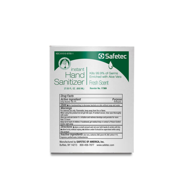 Safetec’s Fresh Bag-in-Box Instant Hand Sanitizer for automatic dispensers is your key to on-demand hand hygiene. The sanitizer not only effectively eliminates harmful microorganisms but also pampers your skin with the soothing properties of aloe vera. While it fights off 99.99% of germs, the aloe vera leaves your skin feeling soft and healthy. Ensure that effective hand sanitizer is accessible anytime and help guests, customers, and employees maintain clean and germ-free hands. Compatiable with Safetec’s automatic dispenser, item #27508.