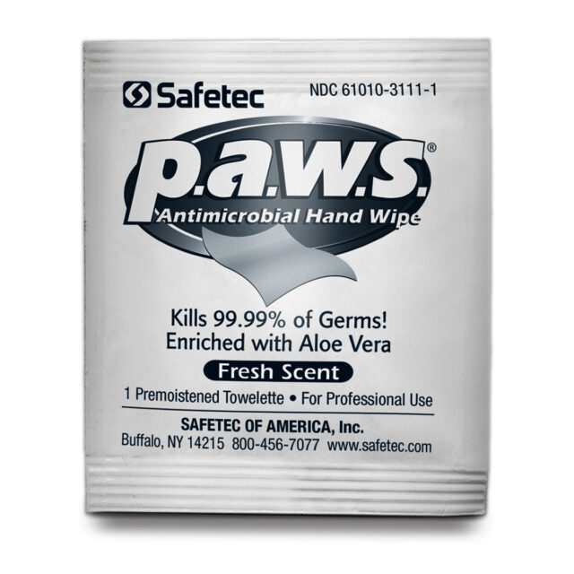 Safetec’s p.a.w.s.® Antimicrobial Hand Wipes are efficient at removing germs, debris, and soil from your hands. Perfect for use on-the-go, they help you maintain hand hygiene by killing 99.99% of germs while maintaining soft skin with aloe vera. Our individually packaged bulk option is great for kit packers, refilling first aid kits, or as a standalone.
